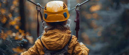 A woman is hanging from a rope in a forest. She is wearing a yellow jacket and a yellow helmet. The scene is adventurous and exciting