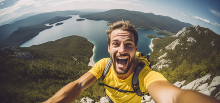 Capturing Thrilling Heights: A Young Hiker's Selfie Adventure at the Mountain Peak