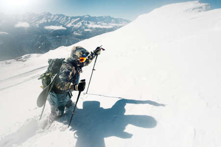man skier in flight after jumping from a kicker in the spring against the backdrop of mountains and blue sky. Close-up wide angle. The concept of closing the ski season and skiing in spring