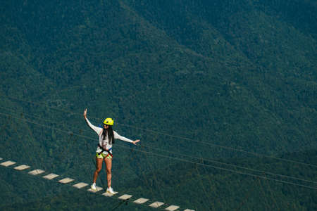 Sochi, Russia, 17 September 2020 - a young fearless woman walks on a rope bridge over a precipice high in the mountains