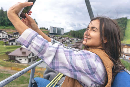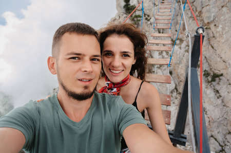 Selfie-portrait of a young couple in love against the backdrop of a mountainous area and a rope bridge. The concept of tourism, shared recreation