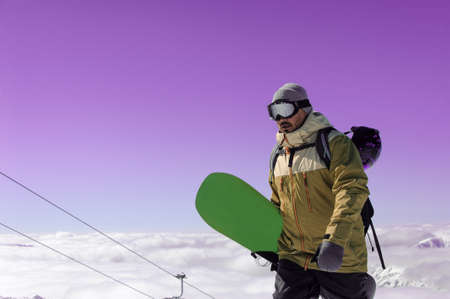 man in ski equipment, wearing glasses and with a green snowboard in his hand walking along the snow to a mountain lift