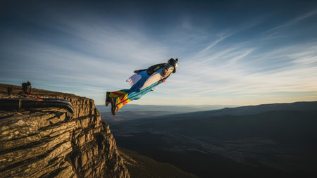 base-jumper prepears to jump from the cliff at sunrise in the mountains