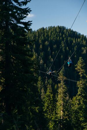ZIPLINE thru the forest foliage in a Vancouver park, British Columbia, Canada.