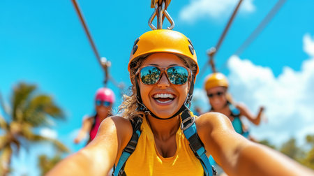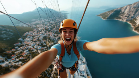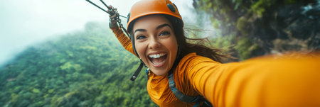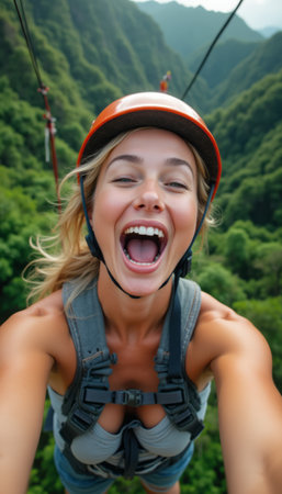 Exhilarating Zip Line Adventure Woman s Joyful Selfie Soaring Over Lush Rainforest Canopy.