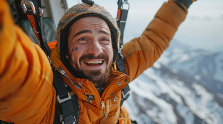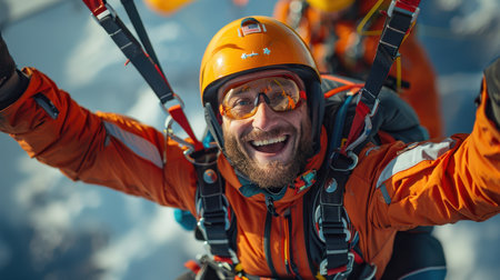 A skydiver dressed in an orange suit in mid-flight, surrounded by snowy mountain terrain, depicting an incredible moment of adrenaline and adventure during a high-altitude skydive.