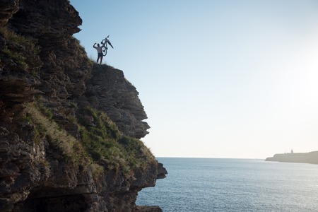 Girls crossing the chasm on the rope bridge. Black sea background, Crimea, Russia