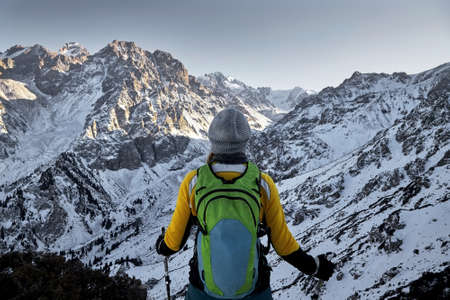 Hiker is standing against mountain landscape near Almaty city, Kazakhstan