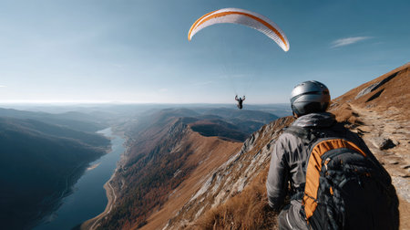 A thrilling paragliding adventure unfolds in a stunning landscape, showcasing a soaring paraglider against a picturesque mountain range and winding river.