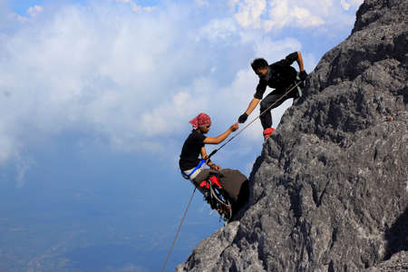 Yogyakarta, Indonesia, 10/25/2014. Climbers cooperate with each other down the lava rock on the peak wall of Merapi using the help of ropes