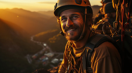 Active climber in protective helmet hanging on mountain holding on to rope in warm light of sunset background.