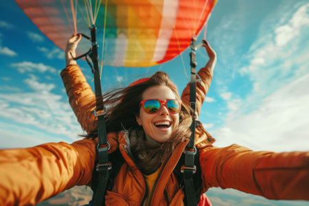 Cheerful happy woman flying in the sky with a parachute. Tourist with parachute flying in the sky.