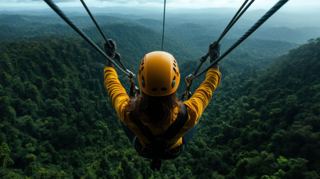 Zip Line Adventure: Young woman enjoying a zip-lining experience over dense forest terrain.