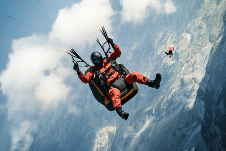 Paragliders flying with a paramotors with beautiful mountain view against blue cloudy sky
