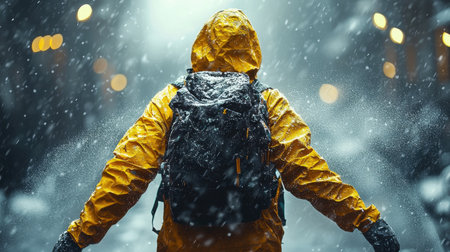 View from back on fully equipped mountaineer in the snowy mountains. Snow storm. Alpinism concept. Generative AI.