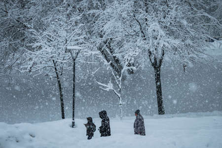 Blizzard bad weather snow and strong wind in the city.