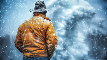 Man in Winter Jacket Braces Against Snowy Wind, Winter Wonderland Scene in the Background