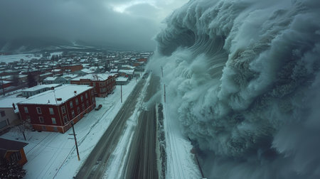 A massive wave crashes onto a frozen landscape, showcasing the raw power of nature. Dark clouds loom above the snowy mountains, creating a dramatic atmosphere.