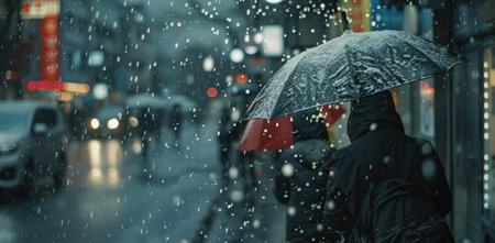 A snow-covered umbrella stands out in an urban setting, capturing the essence of winter. Soft snowflakes drift down against a cold city background, evoking tranquility.