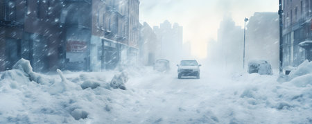Blizzard blankets city in snow amid urban landscape. Concept Snowstorm Cityscape, Winter Wonderland, Urban Blizzard, City Snow Day, Frozen Metropolis