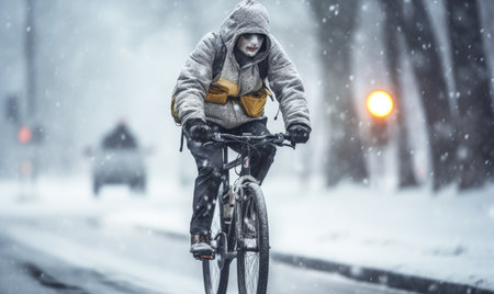 A Man rides a bicycle in a snowfall at the sea side road