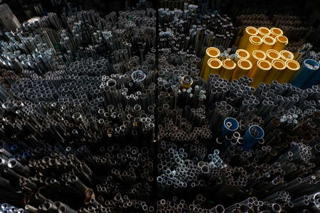 Blur abstract background. stock warehouse many kind of steel tube, carbon steel, pipes round steel. Virous types of steel are new to work construction, industrial, manufacturing and building systems.