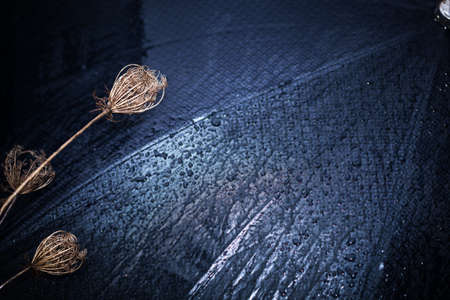 Abstract dark blue background. Dry grass on a blurry background of a wet umbrella. Wet fabric. Abstract dramatic background. Coppy spice.