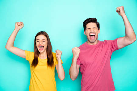 Portrait of his he her she nice attractive overjoyed crazy cheerful cheery couple celebrating spring sale discount great news isolated over bright vivid shine vibrant green blue turquoise background