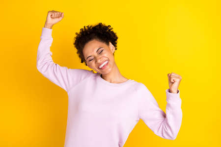 Photo of young happy dark skin positive woman winner raise fists celebrate isolated on yellow color background