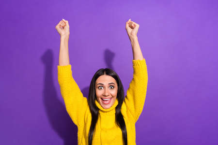 Photo of brown hairdo celebrate young student lady hands fists yell wear yellow shirt isolated on purple background