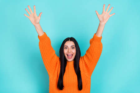 Photo of shiny excited woman wear orange sweater rising arms shouting isolated turquoise color background