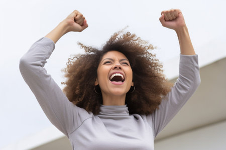shot of a young woman with her arms raised in celebration, created with generative ai