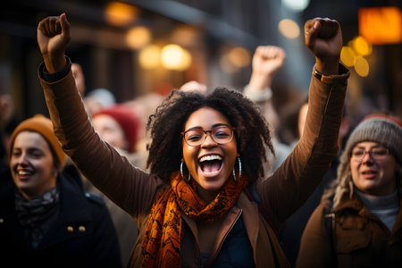 Enthusiastic crowd celebrating with colorful confetti, joyful expressions, and raised hands, creating a vibrant festive atmosphere.