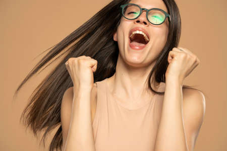 Studio portrait of excited young woman with eyeglasses, cheering on a pink background.