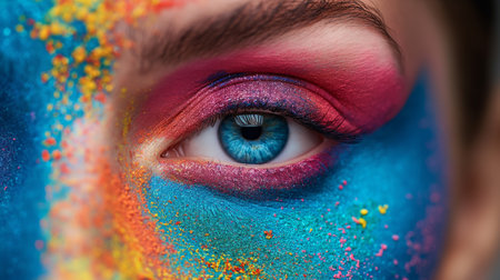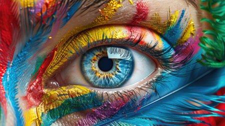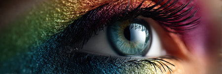 Extreme close-up of an eye with multicolored makeup, high detail, vibrant colors.