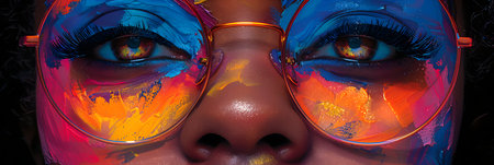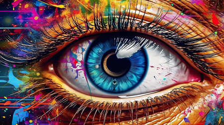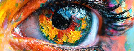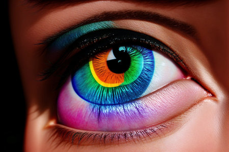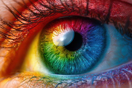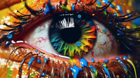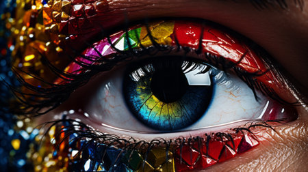Vibrant close-up of a colorful eye showcasing artistic patterns and reflections. Eye with vivid hues and intricate details. Beauty and creativity concept.