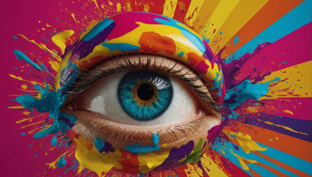 Painting of eye with colorful paint splatters on the iris. Generative AI.