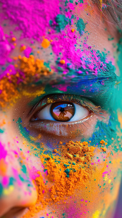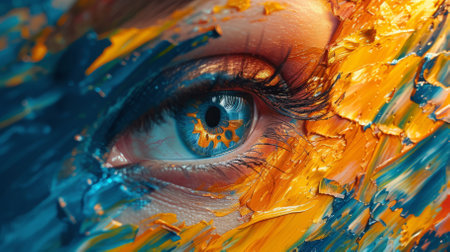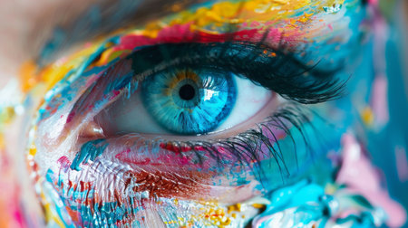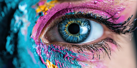 Close up of a persons face with vibrant paint strokes, accentuating a captivating blue eye