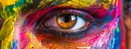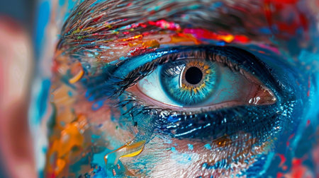 This striking close-up showcases a human eye framed by vibrant and colorful face paint, capturing artistic expression and emotional depth through vivid patterns.