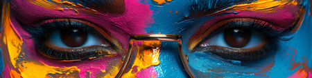 Female eyes close-up on the face with bright spots of multi-colored paint. Banner