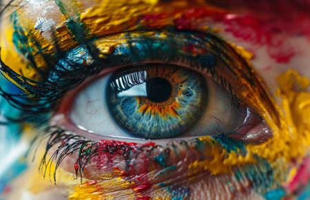 Detailed close-up of a human eye covered in vibrant colorful paint, creating a striking and artistic expression with bold, abstract strokes.