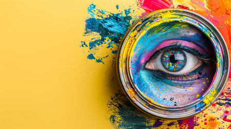 Eyes peeking from paint can on yellow background, vibrant neon rainbow colors, surreal art concept