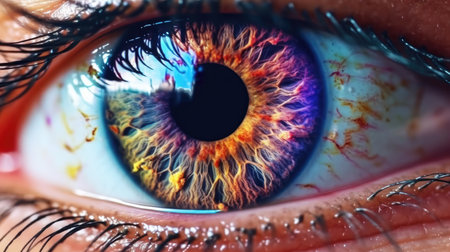 Close-up image of human eye with striking detail, capturing vibrant colors and intricate patterns iris