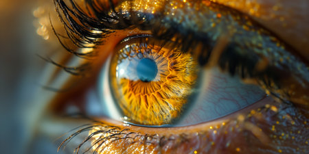 Macro shot of human eye with glowing golden and yellow particles in pupil. Close up of female eye with reflections in iris