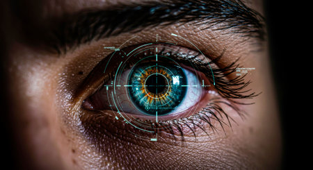 Digital eye scan concept: futuristic biometric technology highlighting iris recognition in a medical setting