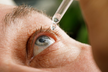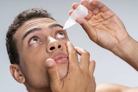 Black guy applying ophthalmology eyedropper. Glaucoma eye prevention, human vision serum wash