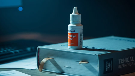 Close-up of an eye drop bottle used for post-cataract surgery care, placed next to glasses on a table.