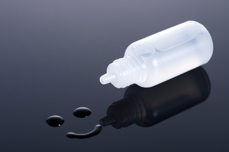 Plain brown glass flask-barrel with a black cover and a glass-dropper which abuts upon, all covered with water drops and is placed on a blacktextured background. Medicine or cosmetics implements concept. Place for text.