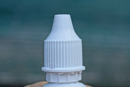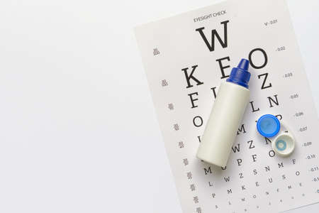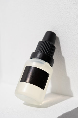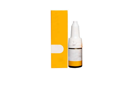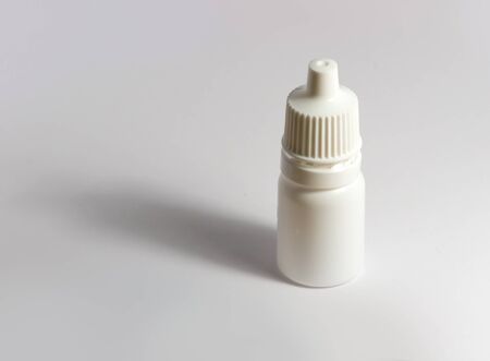 Eye drops bottle with white cap on white background with blank label and copy space, just add your own text. Dry eye disease from smartphone use, digital screen. digital eye strain.