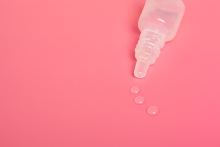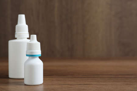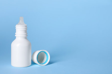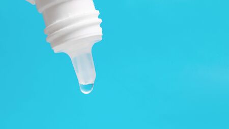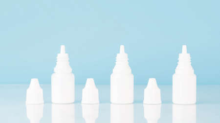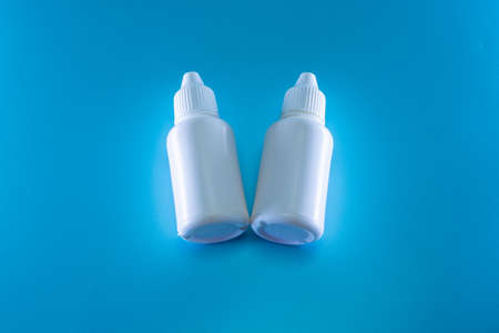 Eye drop or ear drop bottles on light blue background. Blank white plastic container for fluid. Pharmaceutical packaging product.